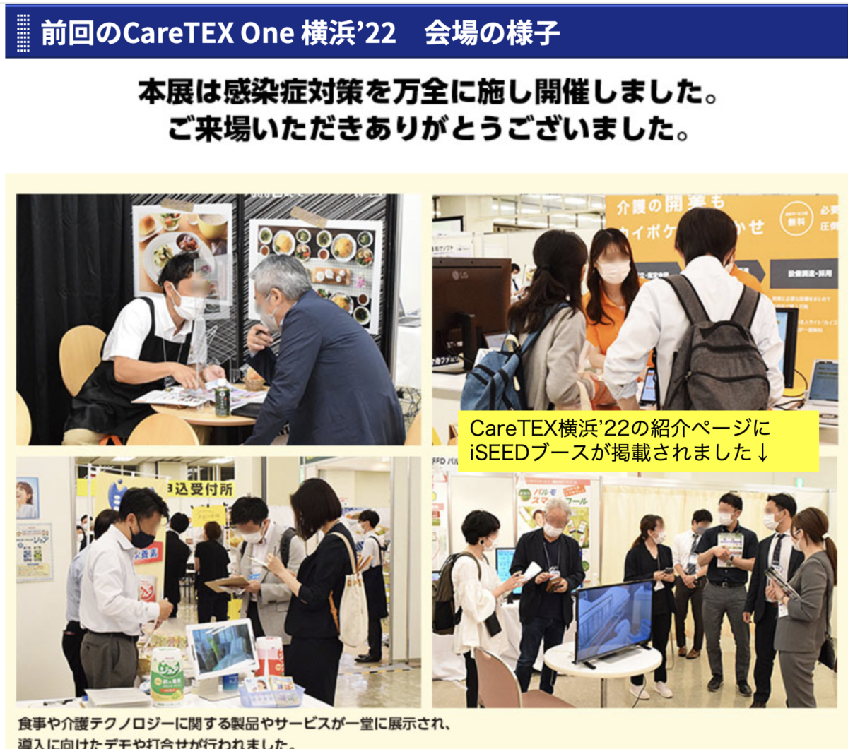 また、CareTEX横浜’22の公式紹介ページにも、iSEEDのブースの様子を掲載いただきました。 このような機会をいただき、心より感謝申し上げます。