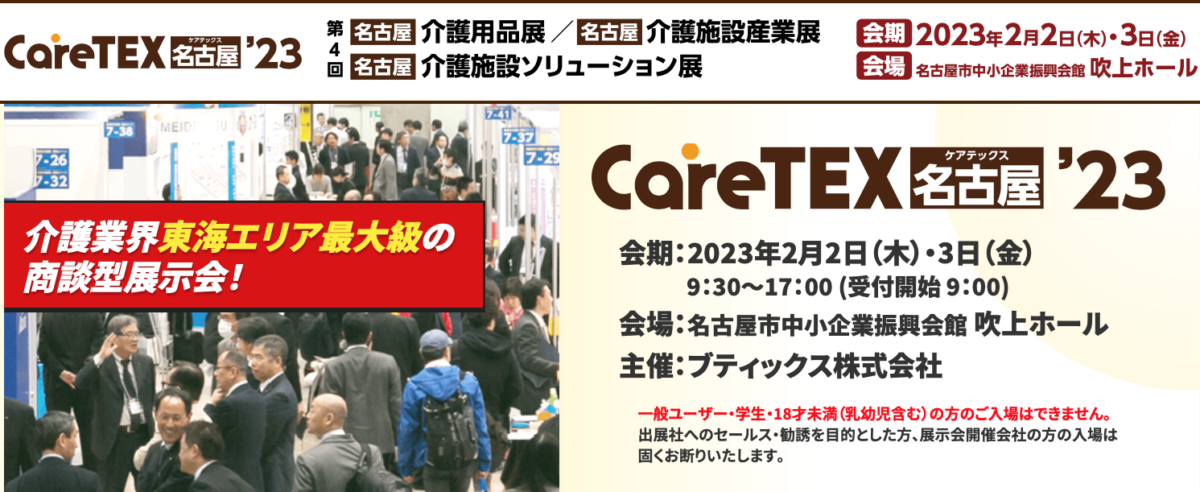 2023年2月2日(木)3日(金) CareTEX名古屋2023が名古屋市中小企業振興会間吹上ホールで開催されました。