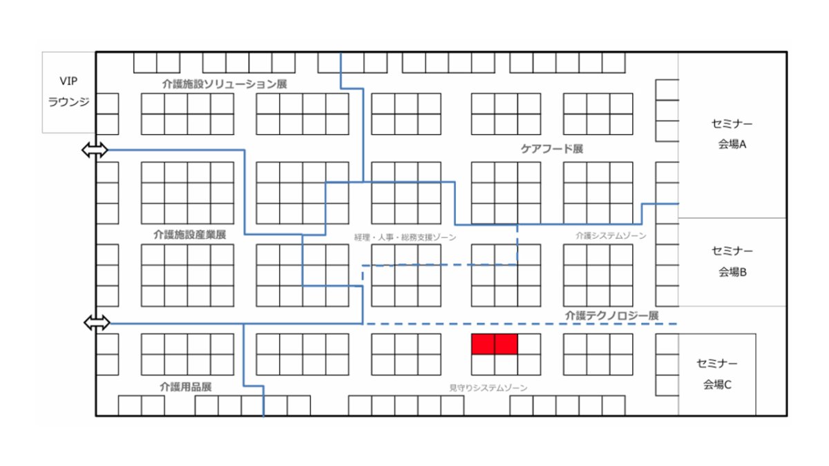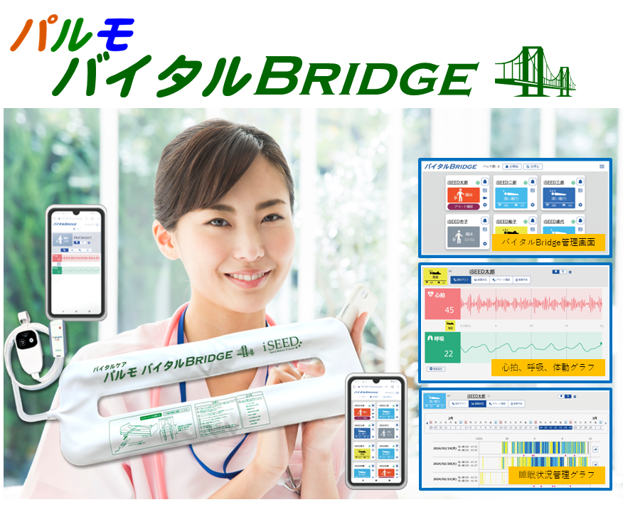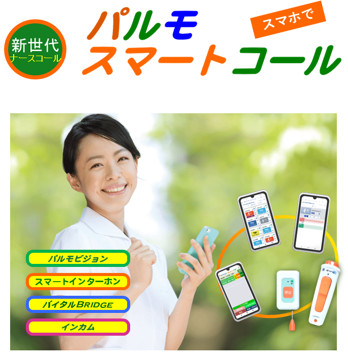 弊社小間番号は4-34となります。今回のブースでは、LoRa 長距離無線搭載の呼出しボタンとスマートフォンを使う新世代の無線ナースコール「パルモスマートコール」や、パルモスマートコールと連動が可能な365日24H見守りできるバイタルセンサー「バイタルBRIDGE」を展示いたします。