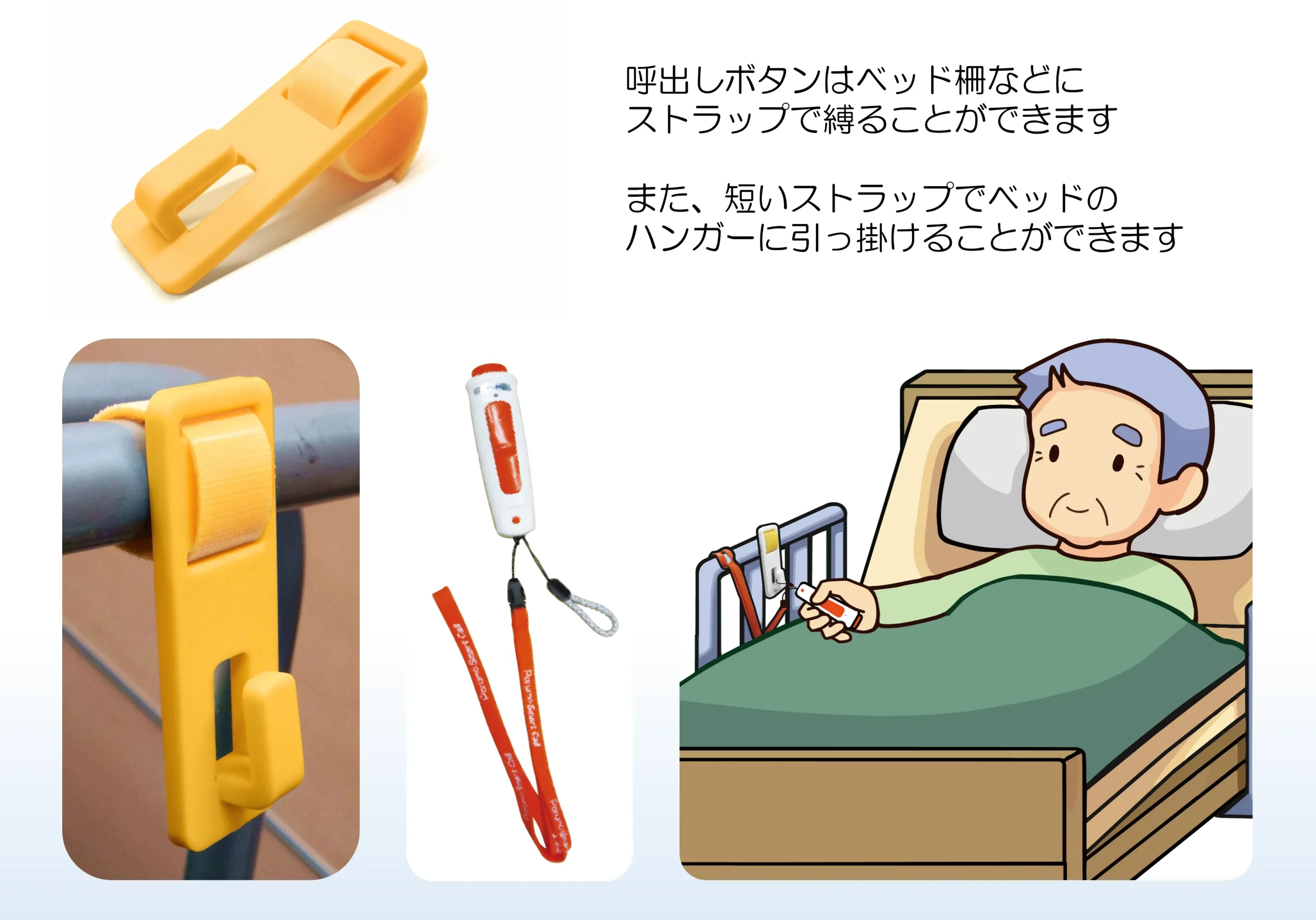 ボタンハンガーを居室ベッドのパイプ部分などに取り付け、ナースコール側に短いストラップタイプと長いネックホルダータイプの2種類をつける事で、レイアウトや居室の方を選ばず自由に設置する事が出来ます。