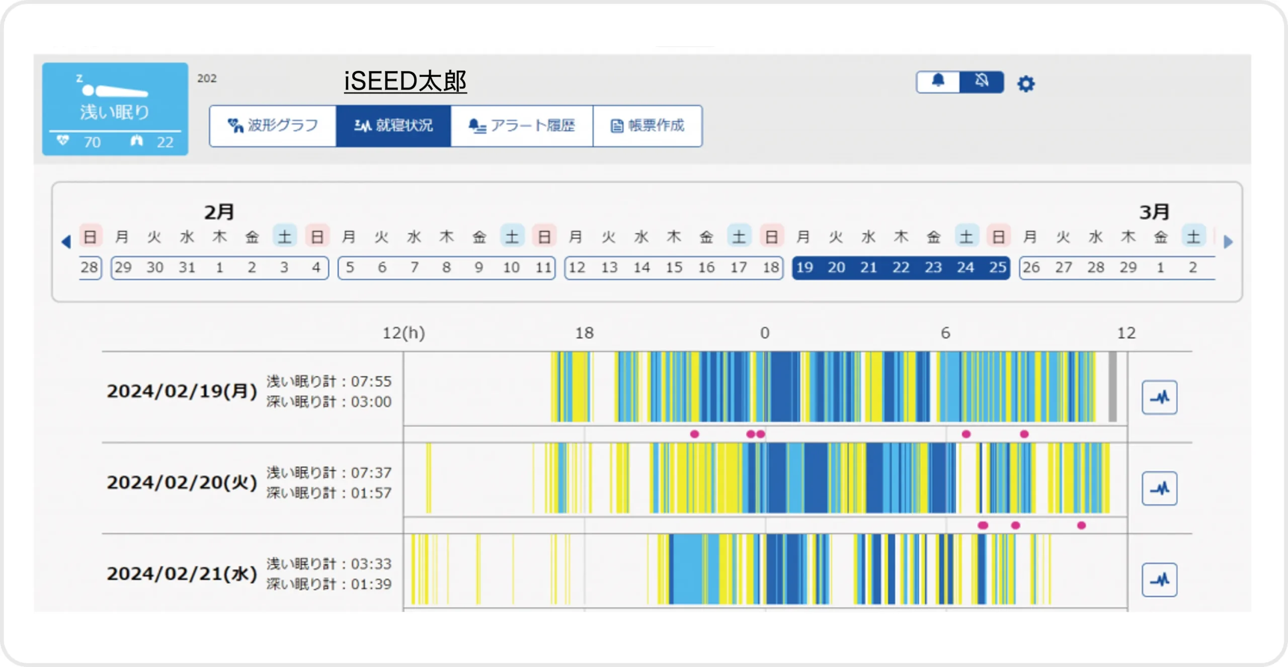 睡眠の状況が深い眠り、浅い眠り、覚醒の3段階で識別し、1週間分のデータを貯められるため、ケアのタイミング・日中の関わり方の検討やお薬の経過観察に役立ちます。