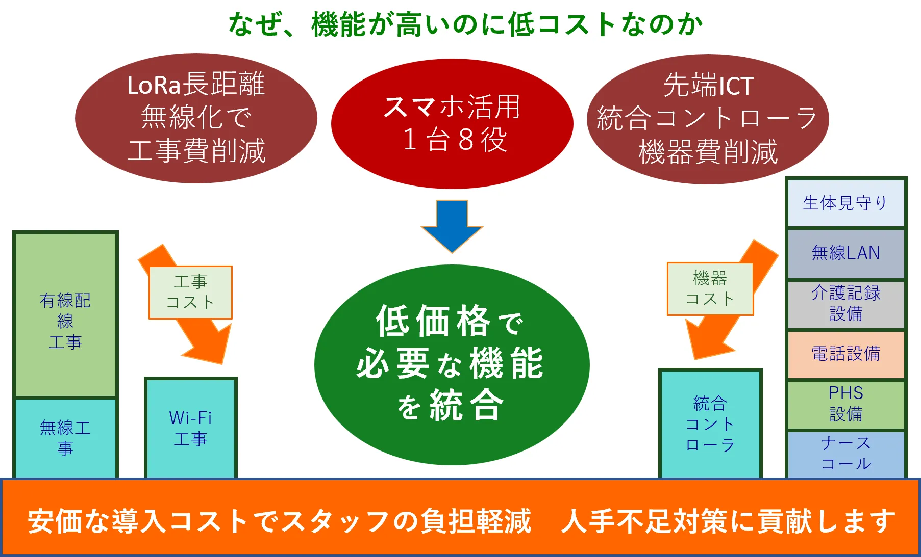 ワイヤレス化で配線工事を大幅削減、工事費が低価格となりました。ハンディ端末にスマートフォンを採用しました。これまでのナースコールの多くの設備を一つの統合設備にまとめ、機器コストも削減しました。スマートフォンの活用で多くの機能が利用でき、ずっと使い易くなりました。