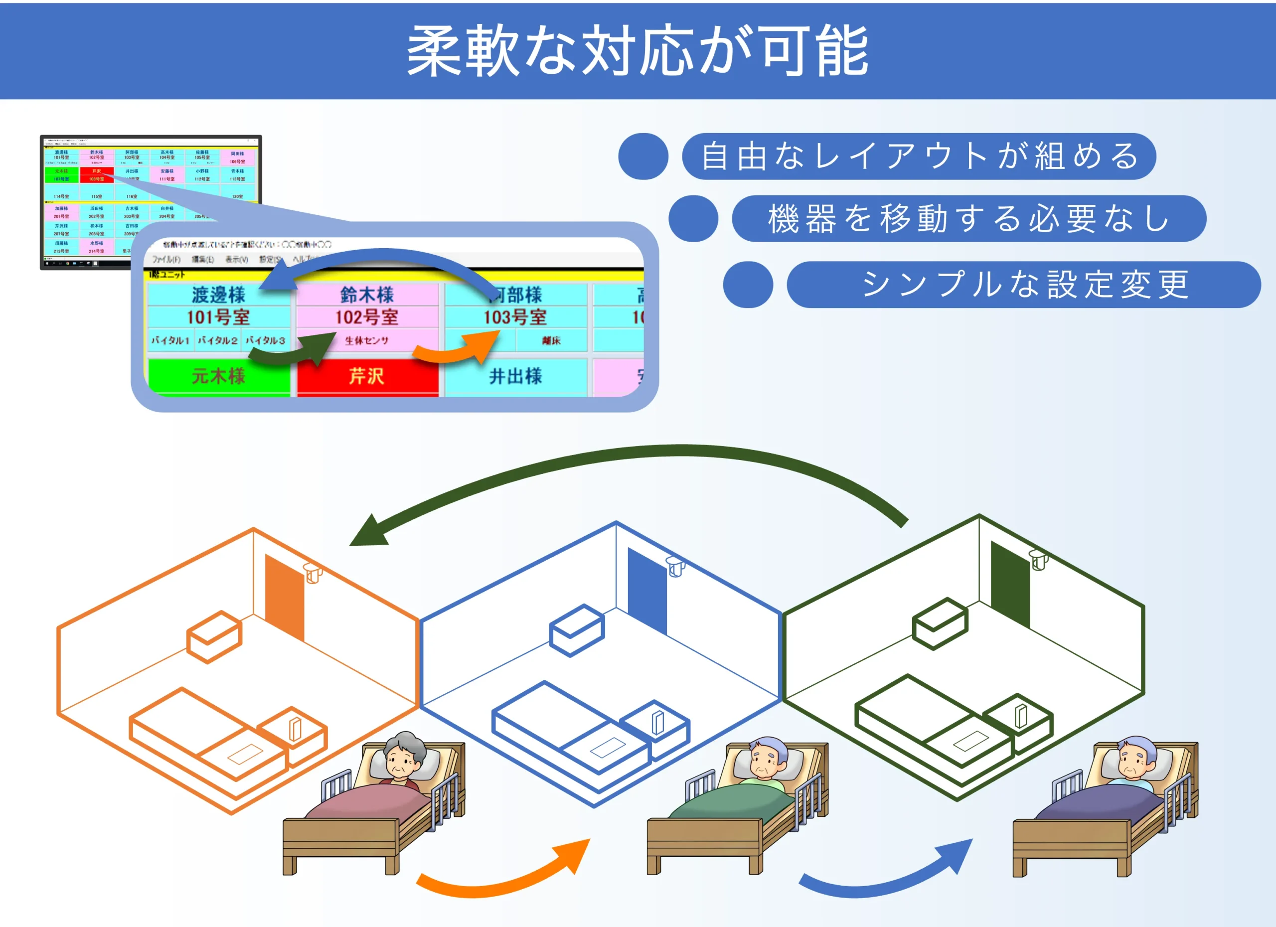 LoRa無線により、配線が邪魔になることがなく、居室内のレイアウトが自由に変更することができます。また、入居者様の入れ替えの際のお名前の変更や、センサーやカメラの移動などの設定を管理PCで行うことができます。