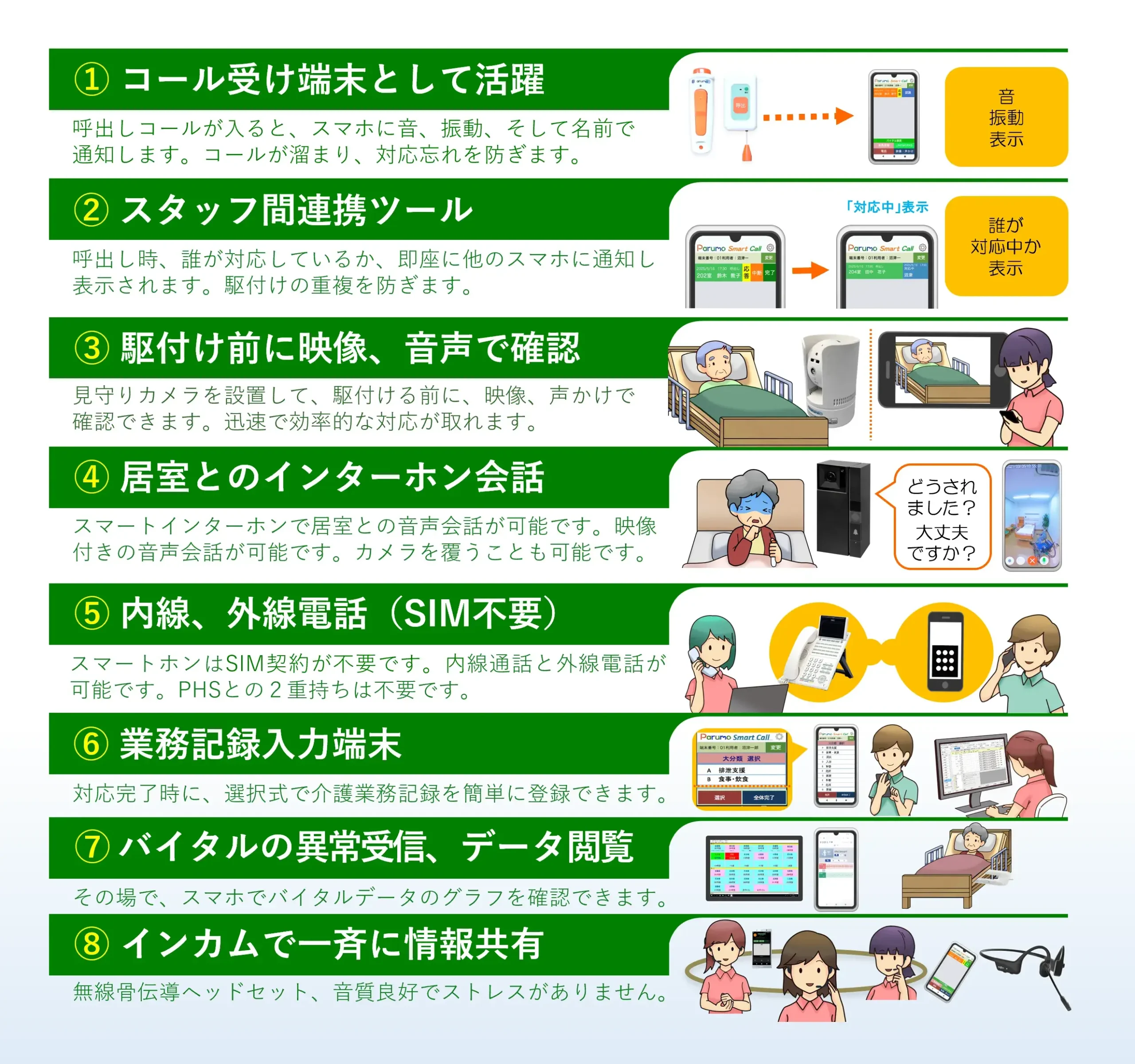 スマートホンの活用(1台8役) 従来ナースコールの「PHS」の時代が終りつつあります
