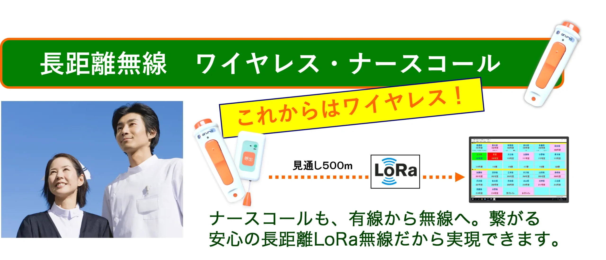 新しい画期的な通信方式LoRaが生まれました。LoRaは世界的標準で、低消費電力で、免許不要の920MHz帯、スペクトル拡散という技術を組合せて、非常に長距離通信を可能にしたものです。LoRa搭載の呼出しボタンは、無線でも安心の繋がり易さを実現しました。低消費電力なのでボタン電池ですが、約2年電池が持つように設計されています。