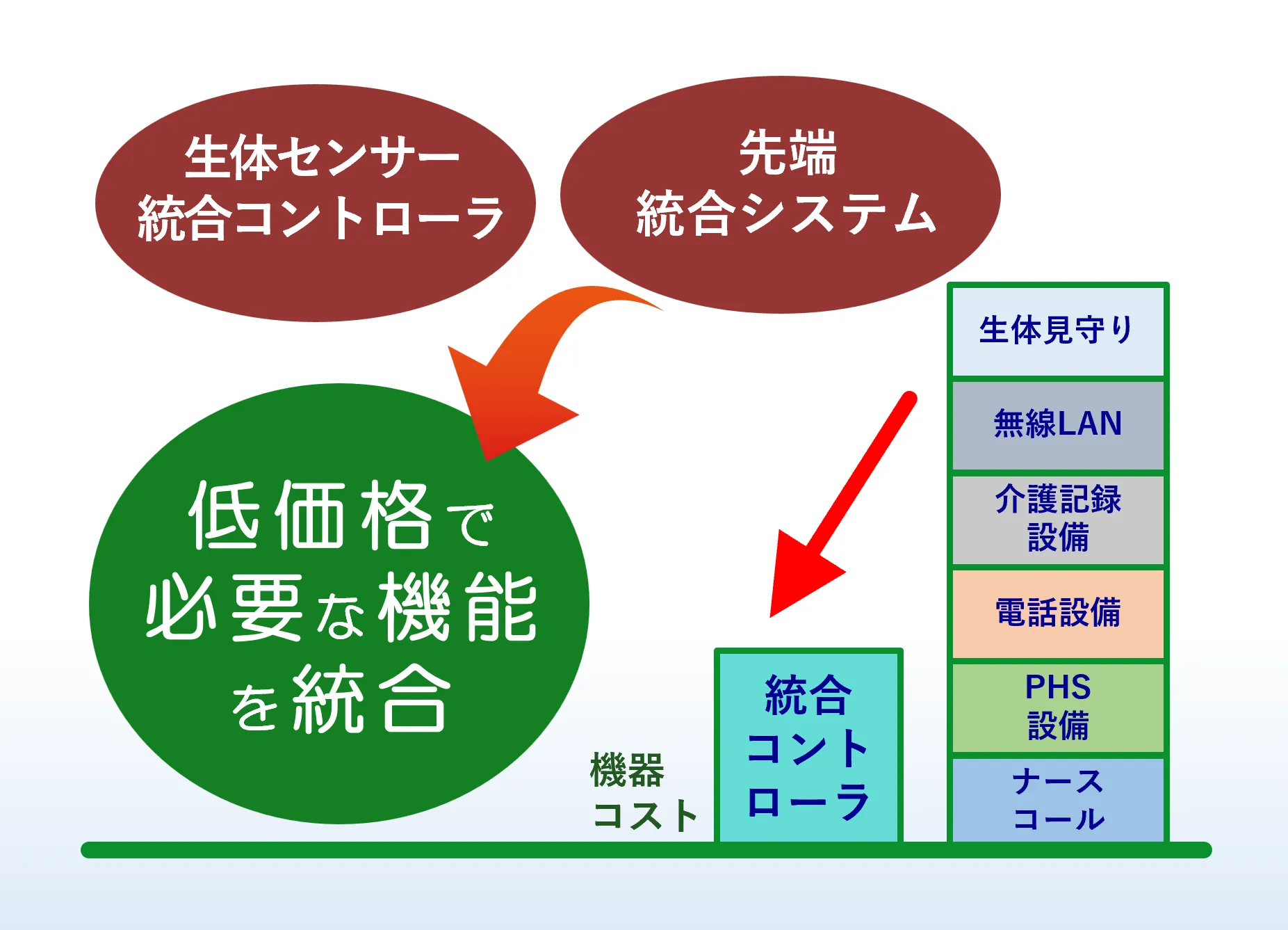 これまでのナースコールは多くの設備の組合せで機器コストが高価でした。